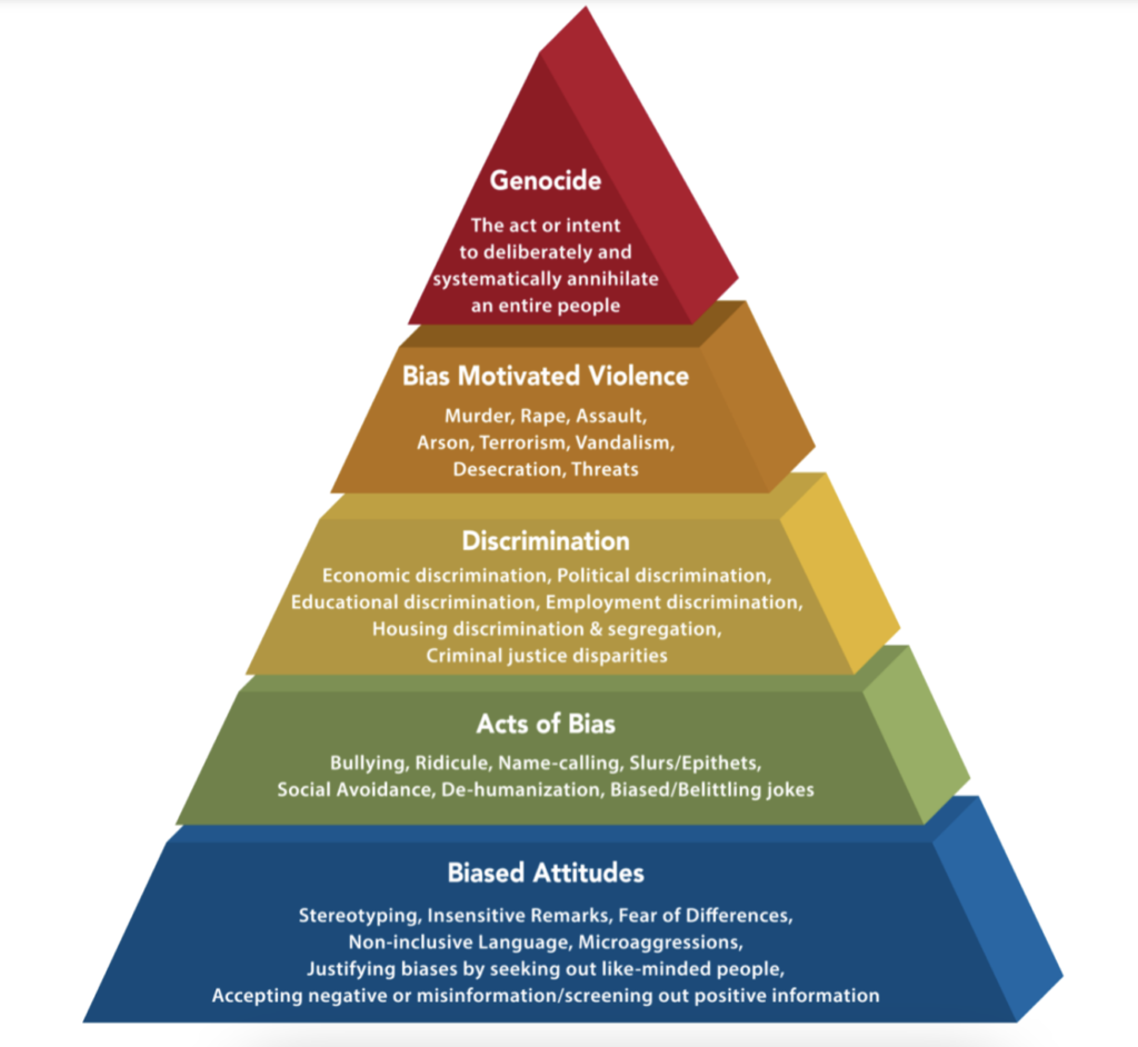 The first of the projects involves creating a public service announcement to raise awareness of an issue they care about (related to the Pyramid of Hate (below) and the Pyramid of Alliance). They can use any medium they wish from paper and pen to whatever technological tools they have at their disposal. As we are back to online learning, no doubt most will choose a digital medium.